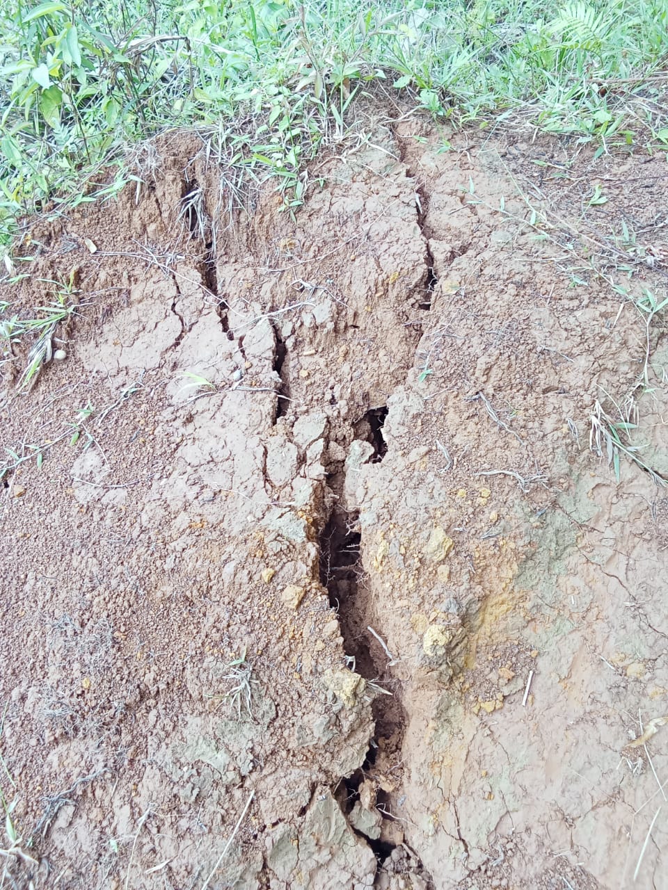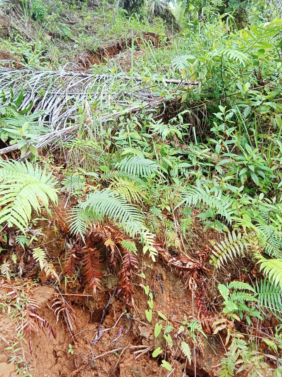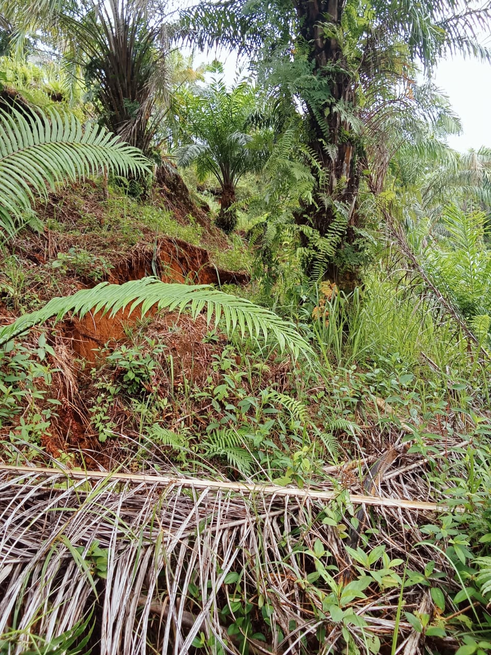 Berdasarkan pengamatan di lapangan, kondisi tanah yang retak berada di lereng perbukitan yang mengarah langsung ke sungai. Retakan ini diduga kuat terjadi karena hilangnya daya ikat tanah akibat minimnya akar pepohonan keras. Di sekitar area retakan, tumbuhan yang tersisa didominasi oleh tanaman kelapa sawit dan nilam yang tidak memiliki akar tunggang dan tidak cukup kuat untuk menahan struktur tanah di kemiringan curam.